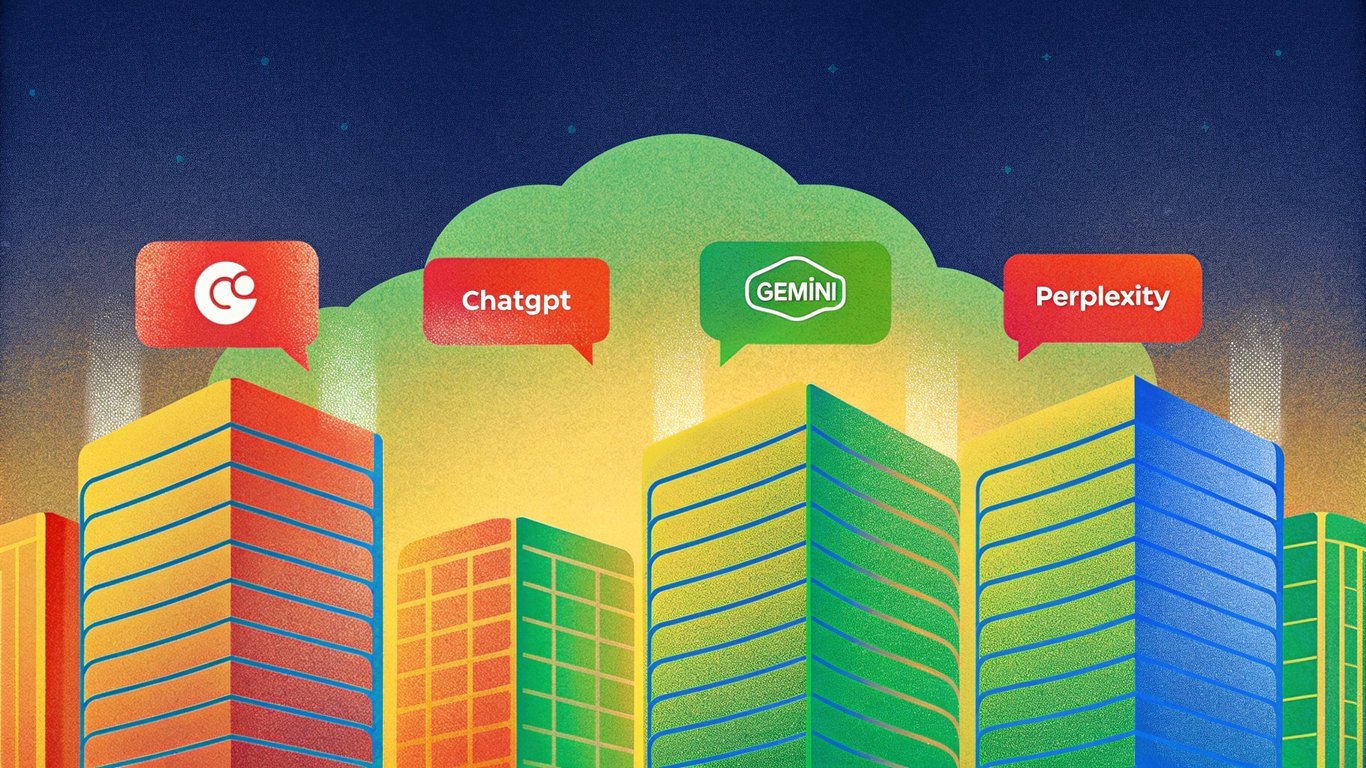 • A sleek, futuristic cityscape at twilight, with glowing AI chat bubbles and search result panels hovering over towering skyscrapers, where a single brand logo emerges bright and illuminated against the night sky.